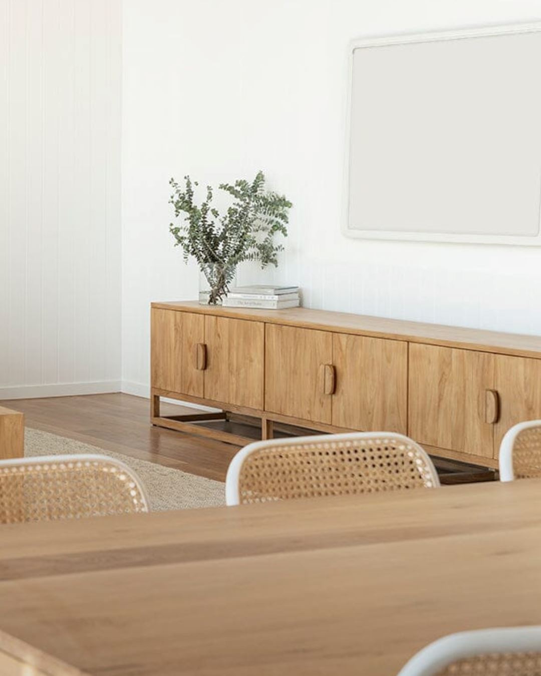 Its defining feature, arched doors with natural rattan mesh insets — adds warmth, texture, and organic beauty, creating a piece that’s as stunning as it is functional. The magnetic push-to-open doors eliminate the need for handles, offering a clean, seamless finish that enhances its modern coastal aesthetic.