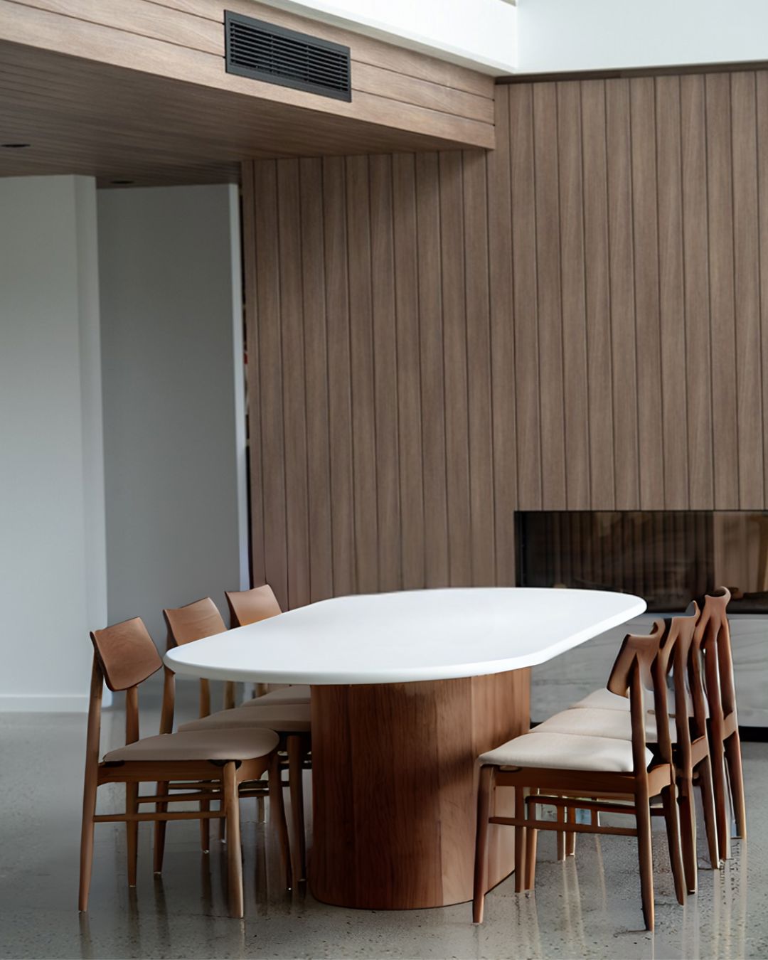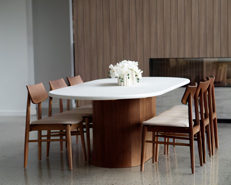 Gather in style with the Jansen Dining Table, a beautifully crafted centrepiece that blends modern sophistication with natural warmth. Designed for both everyday dining and special occasions, this table features a sleek white microcement tabletop resting on an oval European Oak veneer base, available in Natural Oak or Walnut finishes.