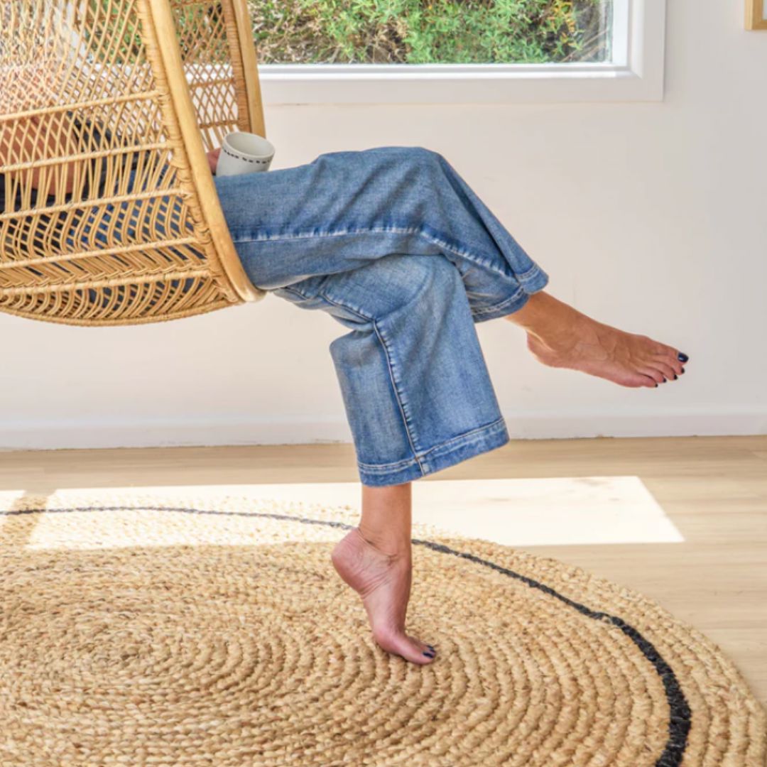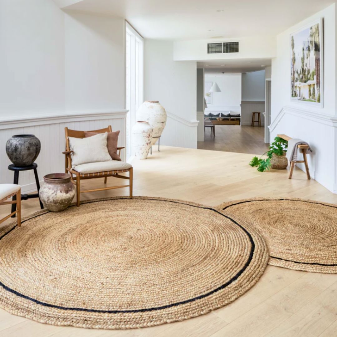 Add timeless texture, warmth, and coastal elegance to your home with our Cooper Round Jute Rug, beautifully handcrafted from organic, sustainable natural jute. Featuring a subtle heritage black stripe woven through a natural base, this artisan-made rug offers a modern yet rustic aesthetic that works effortlessly with coastal, farmhouse, Hamptons, Scandinavian, and minimalist interiors.