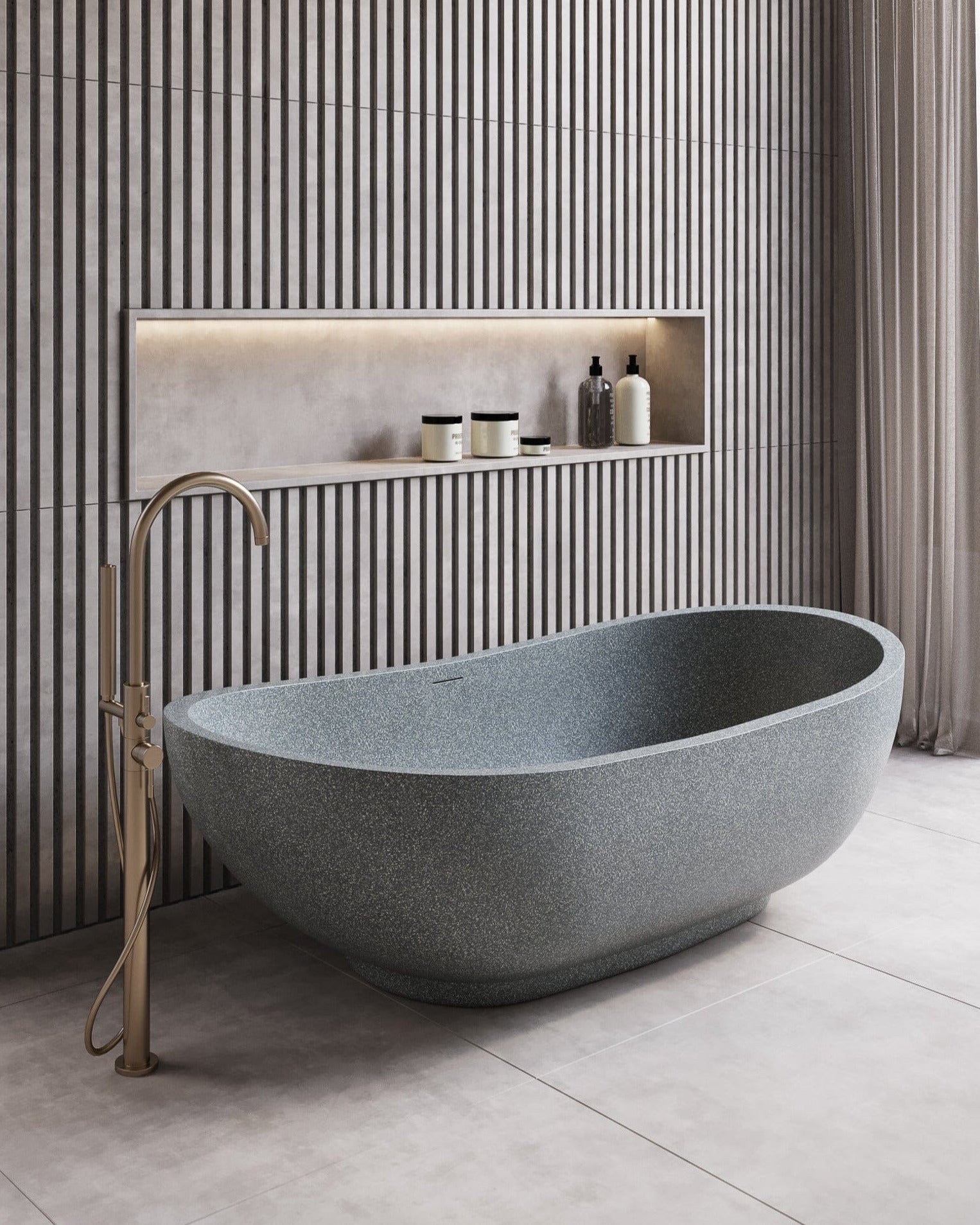 - Freestanding stone bath with sculptural elevated corners and soft contours